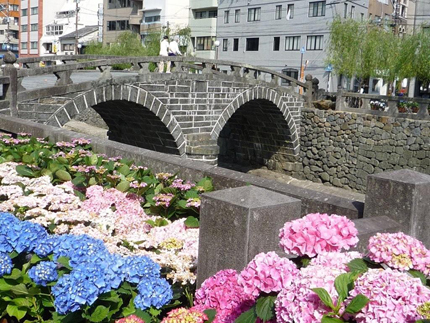 西脇診療所前の眼鏡橋周辺はアジサイが満開。